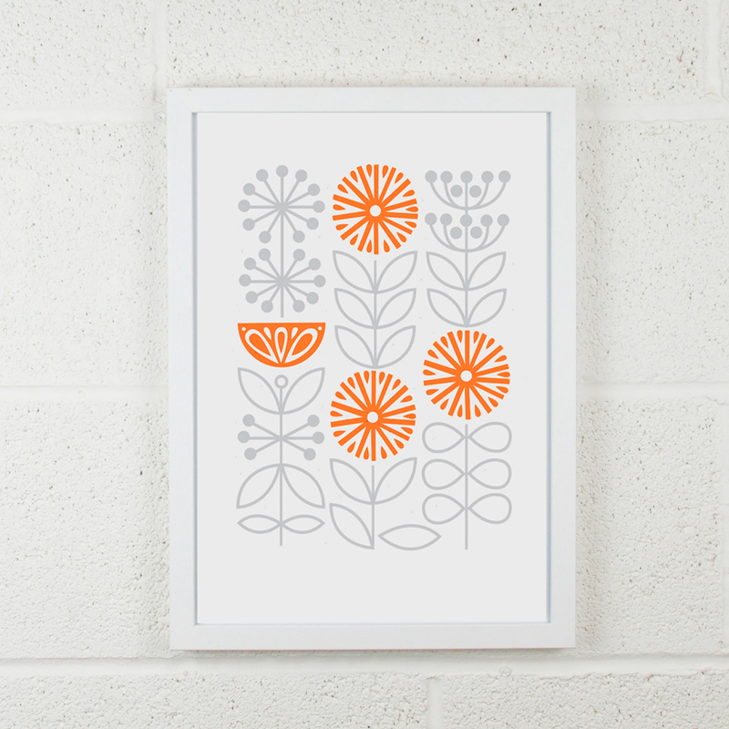A 2 colour risograph print in light grey and bright, vivid orange.